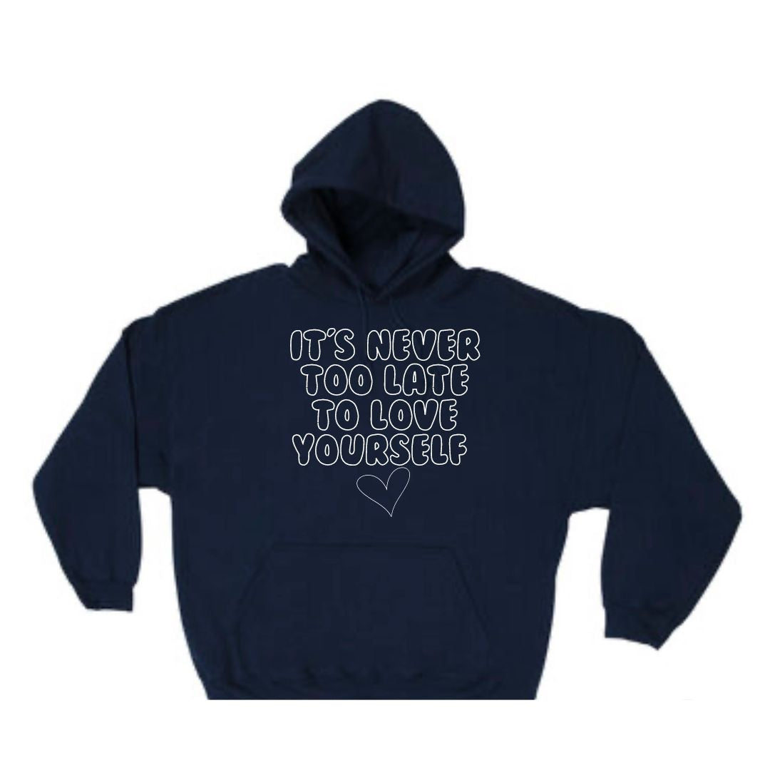 Perfect for the cold weather! - Promote self love and positivity with this hooded sweatshirt that reads "IT'S NEVER TOO LATE TO LOVE YOURSELF"